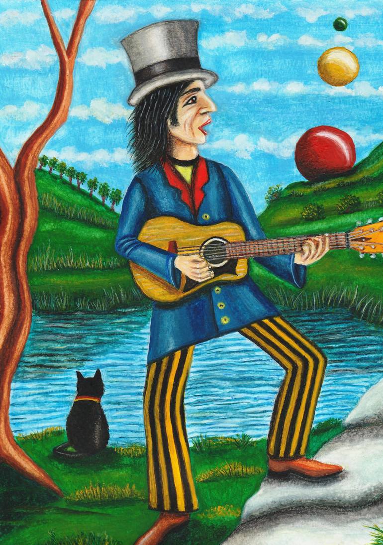 Being a guitarist myself, I thought of painting a Mad Hatter similar to the one in Alice in Wonderland, but with a guitar, top hat & striped trousers. More like a 1960'a Hippie atmosphere, close to my music influence. The black cat by the pond it's just to add surrealism to it