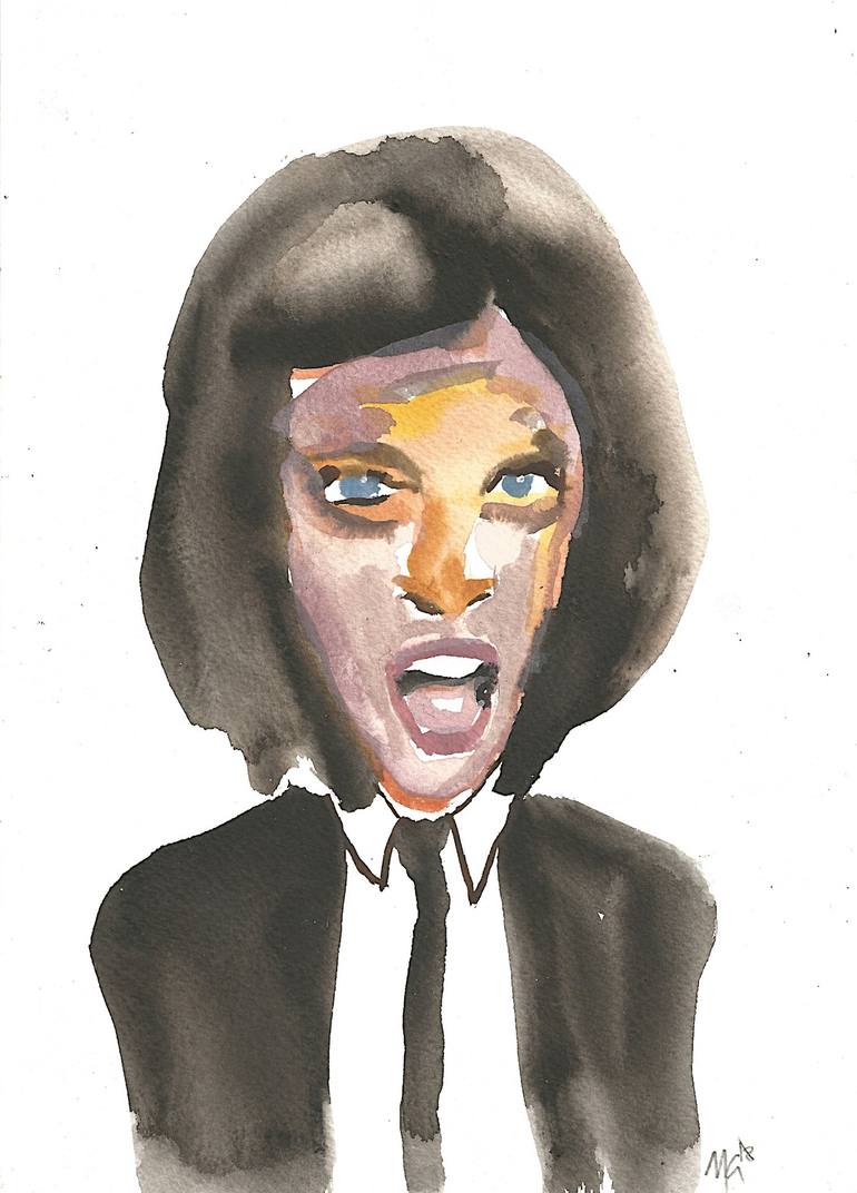 This watercolour on paper is a bit of a dual personality, really. It could be called 'Mad Model', capturing that raw energy and intense expression of the figure. Or, if you're a film buff, you might see it as 'I Wanna Be Uma Thurman's Double', a playful nod to a certain iconic actress. I worked wit...