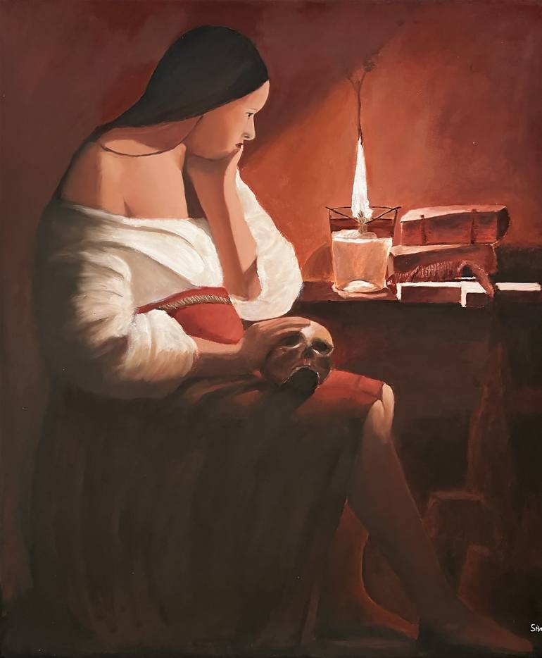 This is a replica of Georges de la Tour's painting "Magdalene with the smoking flame. Painted on linen canvas with water-mixable oils. Magdalene with the Smoking Flame (also titled in French La Madeleine à la veilleuse, and La Madeleine à la flamme filante) is a c. 1640 oil-on-canvas depiction of M...