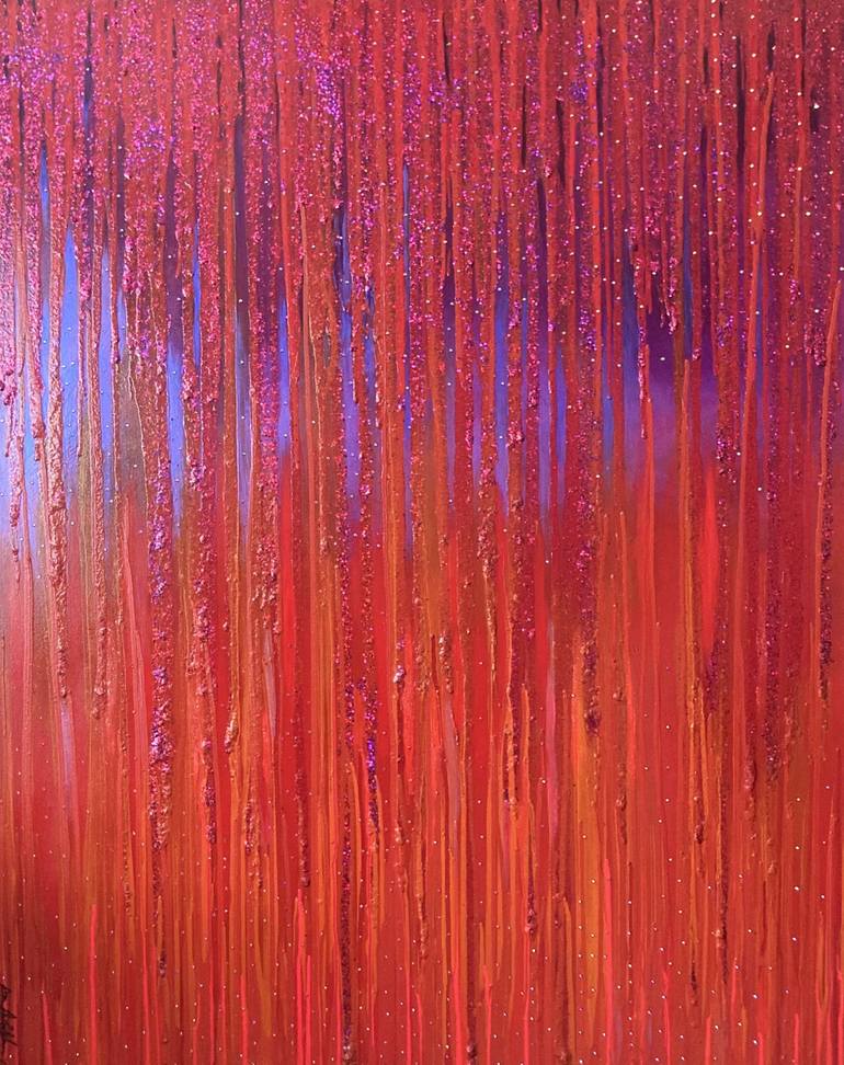 This painting is part of a new series of drip paintings that I have created, This painting uses the vibrancy of a beautiful strong red intertwined with a deep base of Magenta. this painting has well over several hundred Austrian crystals that sparkle when exposed to a light source.