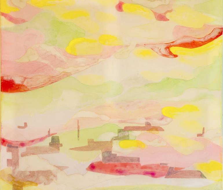 I express sweet and far memory. It's my own and maybe someone else's. I thought of spring clouds or wind. I use acrylic and Japanese paints on a stretched polyester fabric on a wooden frame. The polyester fabric is slightly translucent. I love the surface. I feel the light on those.
