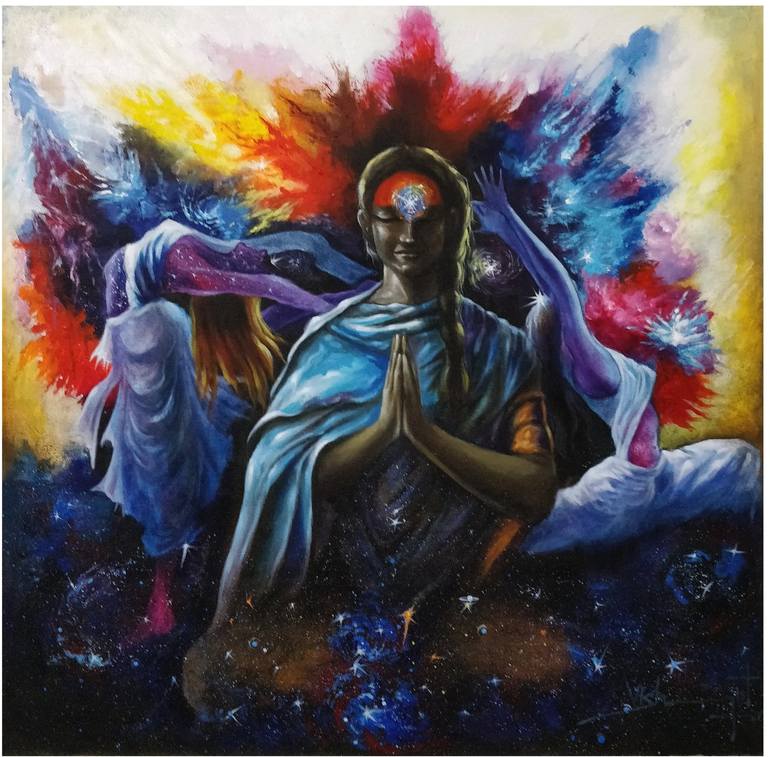 The painting depicts the art of meditation. Meditation and a state of oneness has a positive impact on all relationships, including the one with yourself. It is synonymous to mindfulness and induces an intensified state of cognizance and concentration. The artists views his connection with the Unive...