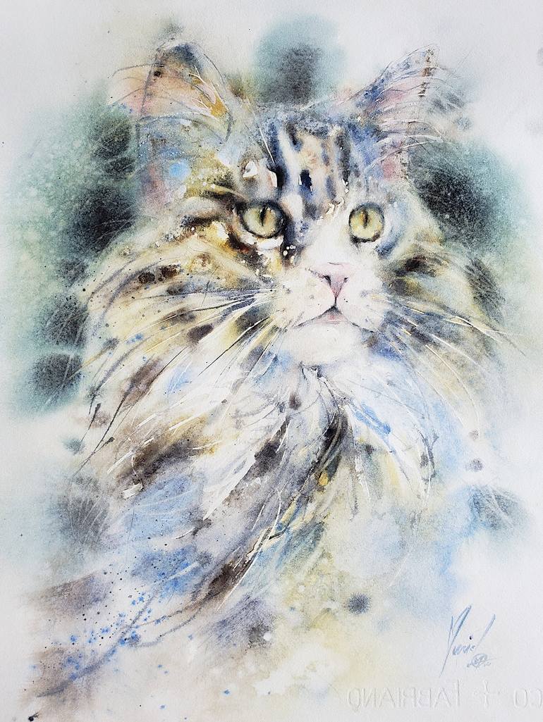 n this work, I sought to capture the mysterious and captivating essence of the cat. I let the colors of my watercolor flow freely onto the paper, suggesting the movement and depth of this majestic creature's coat. Soft hues of blue and gray blend realism and fantasy, evoking a feeling of calm and fa...