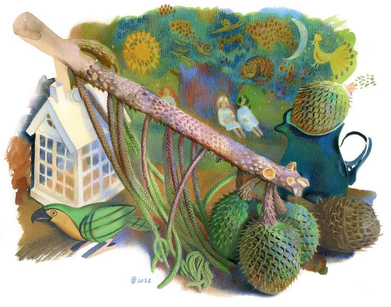 This is a whimsical watercolor painting with colored pencils featuring a vibrant mix of elements including nature and household items, creating an enchanting scene. A prominent branch with intricate details stretches across the image. The background is adorned with various fantastical creatures and...