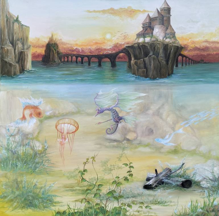This surrealistic oil painting is a scene from a far away planet in a distant solar system. The scene takes place in the sunset surrounded by red and orange clouds on a lake next to a rocky bluff and a castle atop an islet. Part of the painting scene takes place underwater showing a school of fish a...