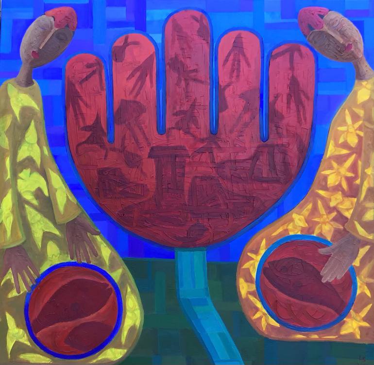 I was inspired by thoughts about two women and friendship between them. A big flower in the middle is the symbol of beauty in relationship, inside the flower are shoe's forms houses, it means rarity, like a good friend. This artwork I started in 2017 and finished in 2020.