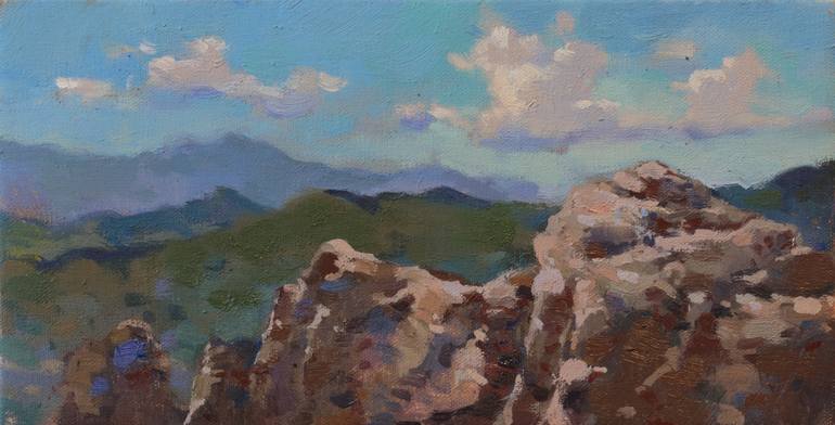Clouds float by on a hot summer day. Distant mountains are dissolved in perspective. Emotions of sun rays on the front rock. Good composition and emotion. I really love landscapes!
