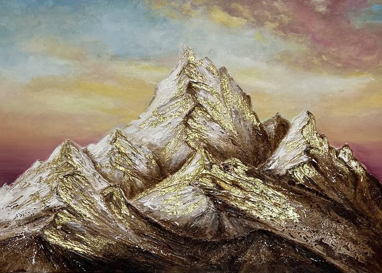 The painting depicting mountains at sunset is made in a modern volumetric painting technique with the use of golden tile. Warm shades of sunset create a play of light and shadow on the mountain peaks. The textured surface makes the details almost tangible, evoking the desire to touch and feel them...