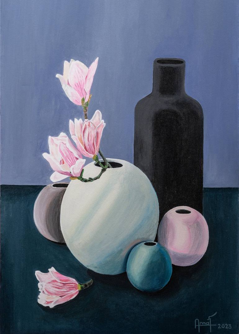 A serene contemporary still life featuring delicate pink magnolia blossoms arranged in modern ceramic vases. The soft pastel palette contrasts gently with deep, muted backgrounds, creating a harmonious balance between light and shadow. The composition reflects both minimalism and elegance, evoking a...