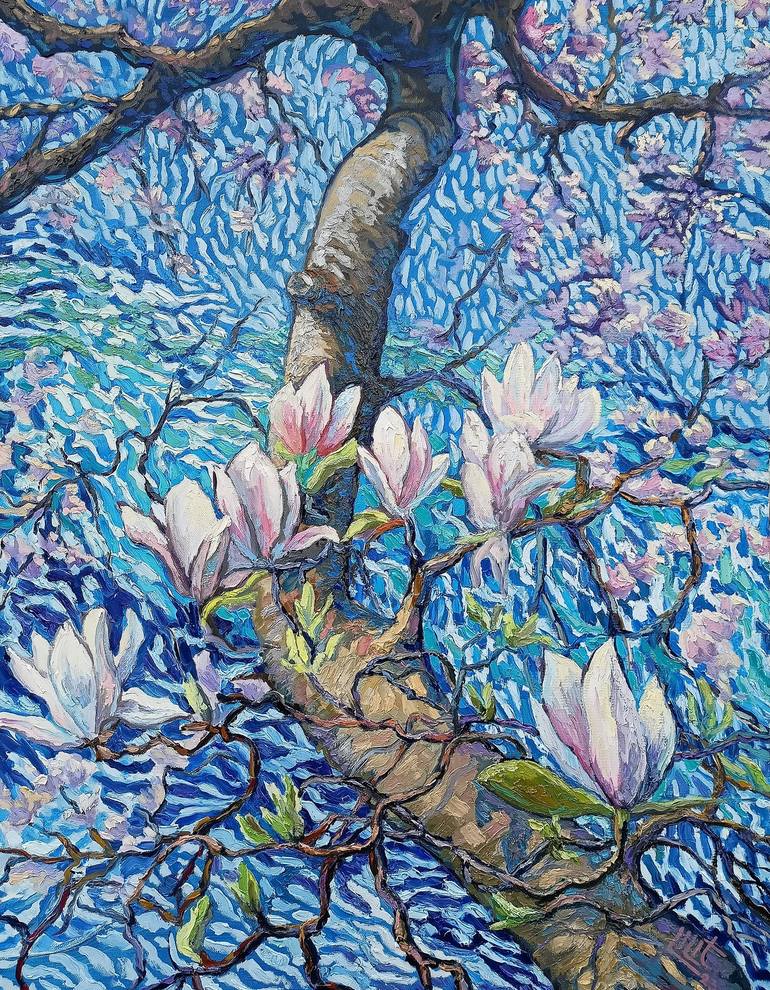 With lighter and textured brushstrokes on the blue background the artist got a unique rhythm and freshness, also expressed the play of air with this manner. As a result, a flurry of brushstrokes was obtained a decorative style. It will give aesthetic and gentle feelings in the different style's inte...
