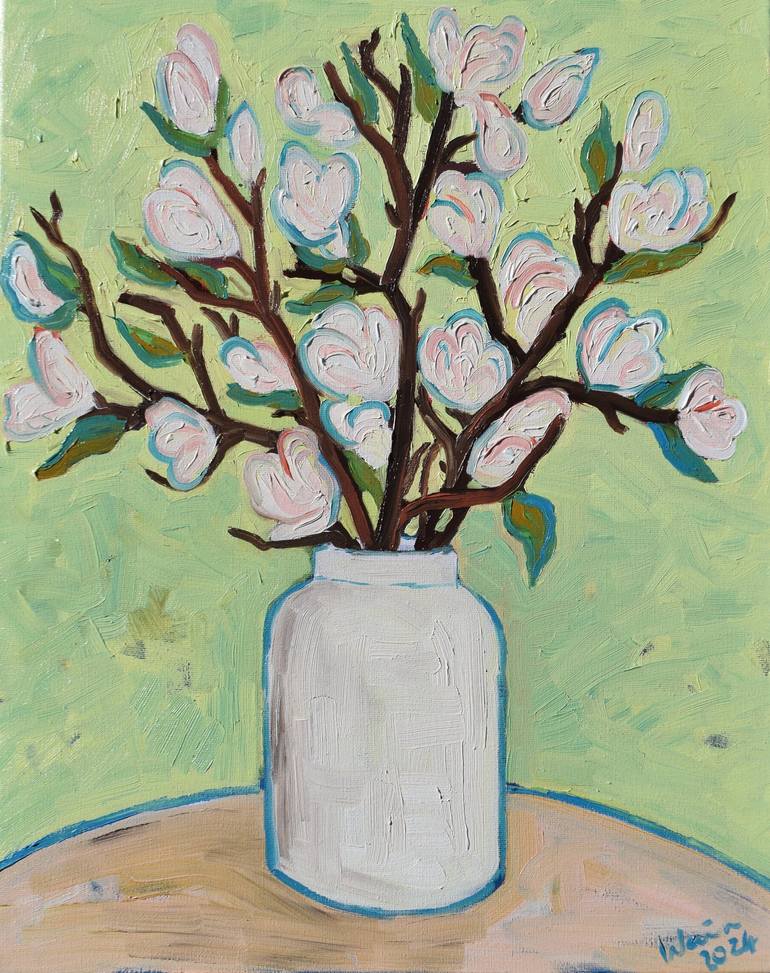 A beautiful textured oil painting on canvas of a vase of Magnolias. Inspired by Vincent Van Gogh's flower paintings. Between 1886 - 1888 Vincent created several flower still life paintings. He stated “If you truly love nature, you will find beauty everywhere.” —Vincent van Gogh This striking paintin...
