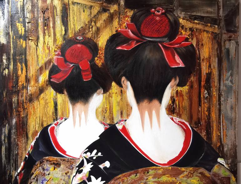 "Maiko – The Vanishing Era" is an exquisite oil painting on canvas (92 x 72 cm), capturing the grace and elegance of two maiko—apprentice geishas—symbolizing the fading beauty of traditional Japanese culture. The delicate brushwork highlights the contrast between their luminous white skin, the deep ...
