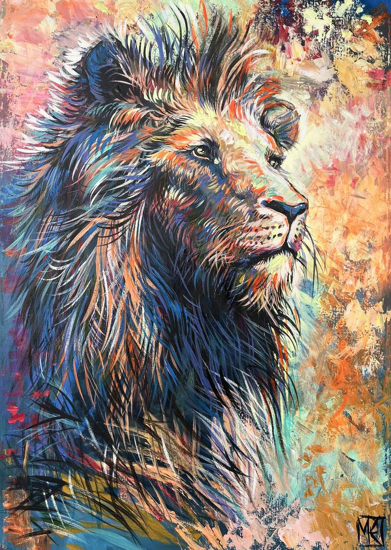 In this vibrant explosion of colors, I captured the regal essence and spirit of a lion. Through the dynamic strokes and vivid palette of acrylics, I melded elements of Expressionism with touches of Realism and Pop Art to evoke the lion's majestic yet introspective presence. This painting serves as a...