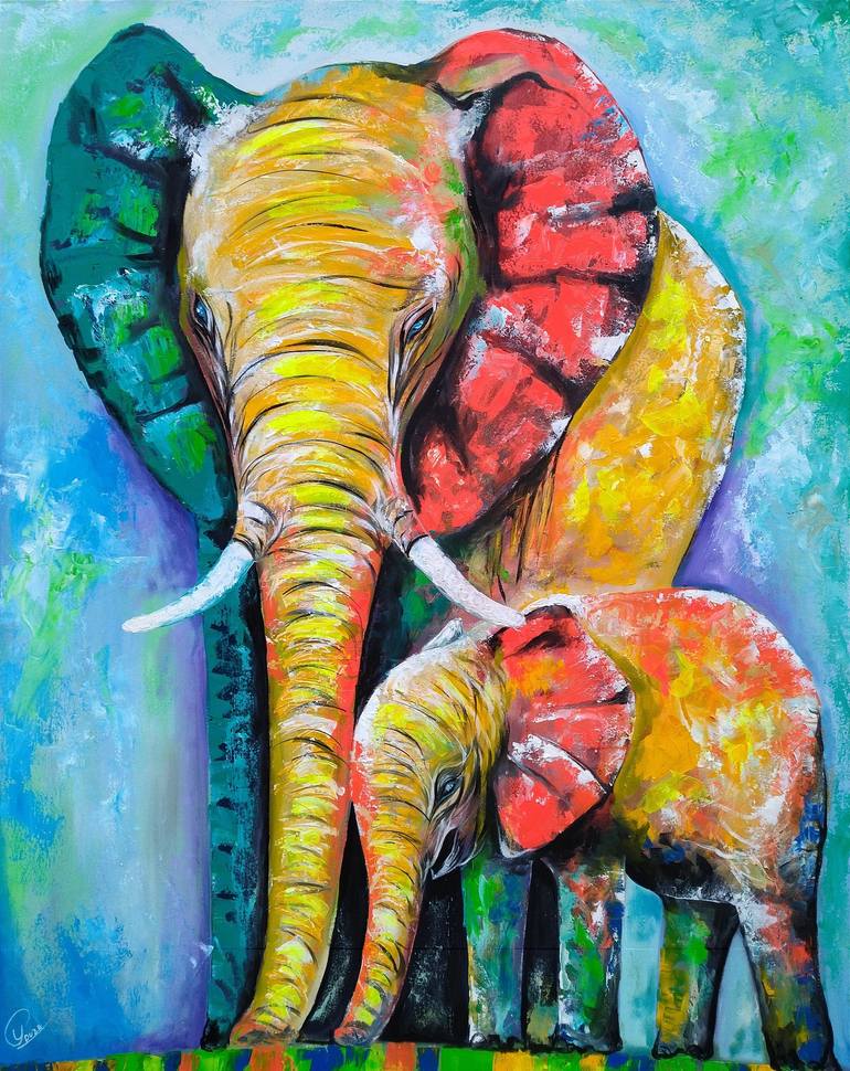 Discover the emotional connection between an adult elephant and its calf in this stunning work of art. Made with bright colors and a predominantly spatula technique, this piece captures the beauty and vitality of these magnificent animals. Observe how the adult elephant tenderly guides its little on...