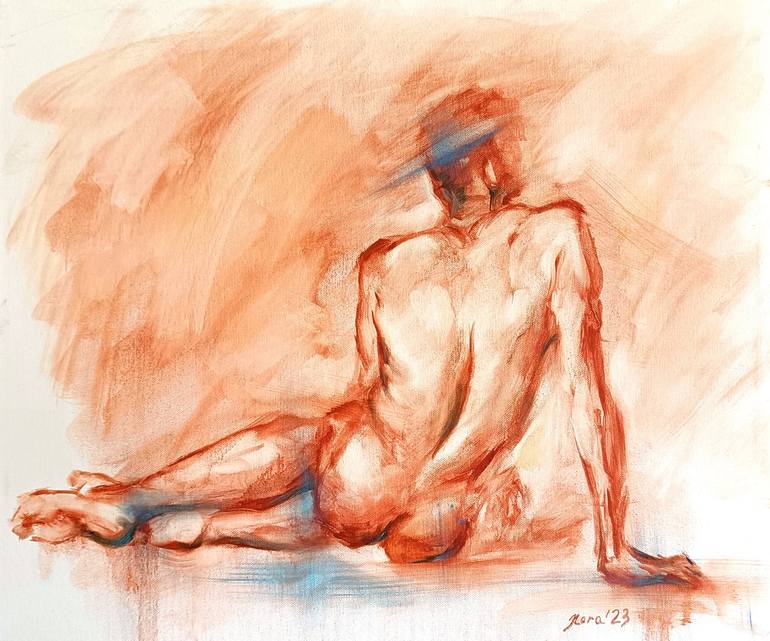 The original oil painting of a nude male model figure was created with a sketching technique that let the artist convey the easiness of the painting process without detailing. Blurred lines and a limited palette make the viewer stop and have an attentive look at the artwork. The painting is middle-s...