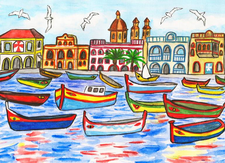 View of Malta, buildings and traditional Maltese boats on water, watercolor painting on paper. This is typical view of Malta island, with traditional specific maltese boats. This painting is inspired by my travelling in Malta. All paintings of travel thematic with views of different towns and cou...