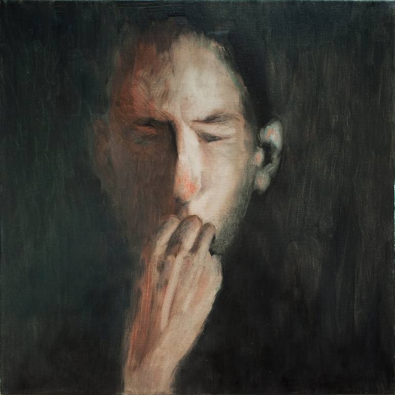 Man with hand over his mouth. 2014. Oil on canvas, 18 x 18 inches, (45.7 x 45.7 cm). If you are interested in purchasing this painting please contact me to check whether it is still available. There is always a possibility that a painting has just been sold.