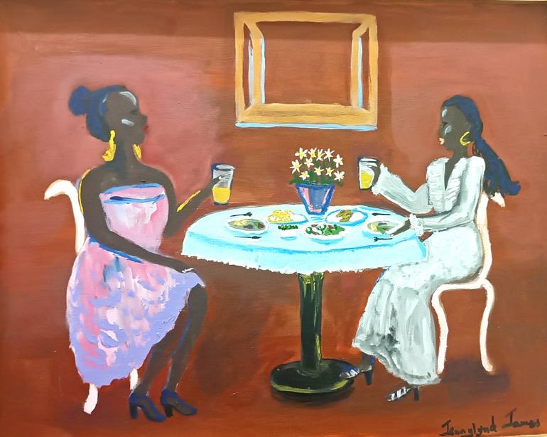Two women sit at a small round table, enjoying drinks and snacks. A framed picture hangs on the wall behind them, and a vase with flowers adorns the table. They are feasting on Sunday left overs, Trinidad style - manque a fourchette. Mak a Fouché is patois for “manque a fourchette”, or left over foo...