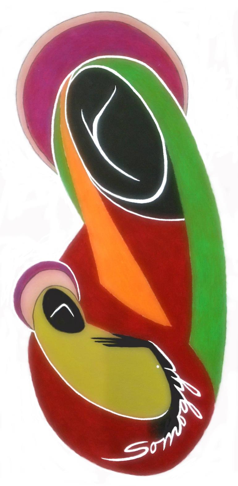 This is a minimalist, modern depiction of Mary and the Christ child in sweeping curving lines and very bright colors.