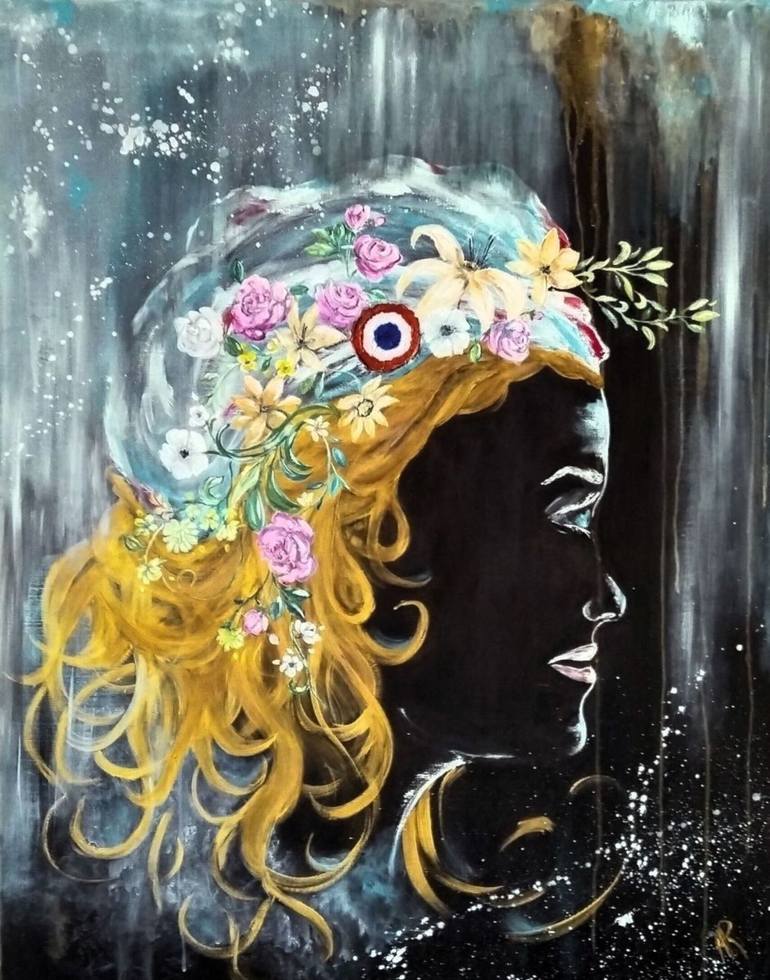 Marianne remains symbolic and modern. A drip of paint, acting as a tear running down her cheek, expresses a certain sadness or melancholy, and adds emotional depth, contrasting with the flowers and the symbol of freedom and resistance that Marianne traditionally embodies. Acrylic paint and tissue pa...