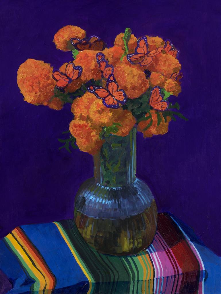 Marigolds and monarch butterflies in a clear base with a Mexican blanket.