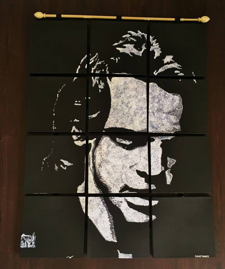 SUN KIL MOON or RED HOUSE PAINTERS fan? This is an original, multi-canvas pointillist painting of Mark Kozelek of Sun Kil Moon and Red House Painters. Each 10" x 10" canvas is attached together by black straps and suspended by a shower rod (or whatever rod you choose). Each canvas can be hung indi...