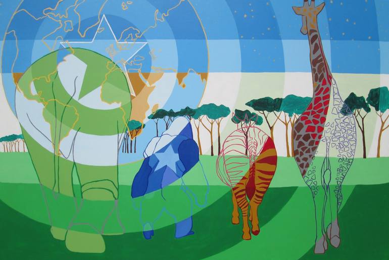 acrylic on canvas, Elephant, gorilla, zebra and giraffe as super heroes Hulk, Captain America, Thor & Iron man saving the day in the park. Also saving my heart.