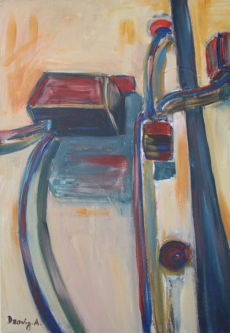 This artwork is a masculine interpretation of electric wires. The artist used strong brushstrokes and vivid colors with a rigid composition.