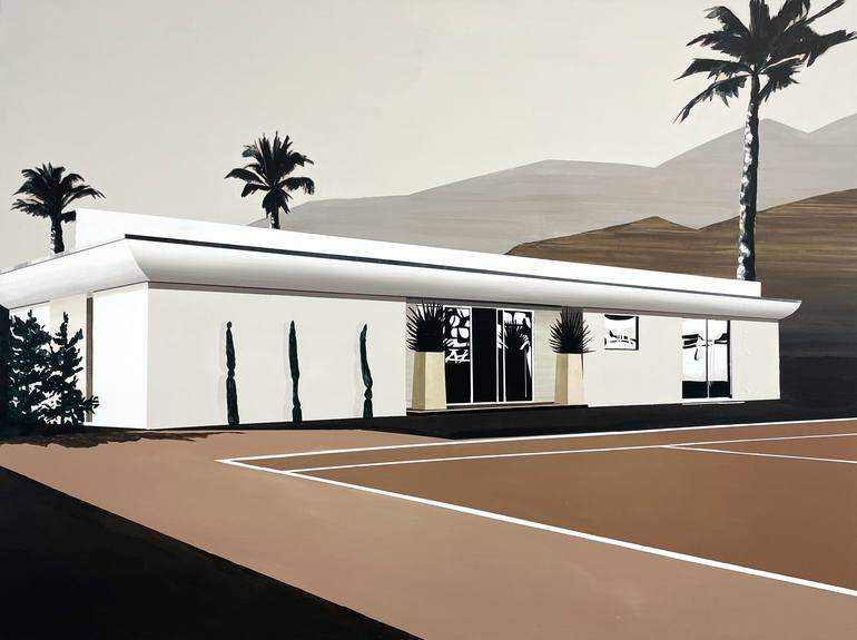 This painting showcases the iconic courthouse designed by Albert Frey in Palm Springs, capturing its distinctive mid-century modern aesthetics. The structure, with its clean lines and minimalist design, stands proudly against a backdrop of towering palm trees swaying in the desert breeze. The color ...