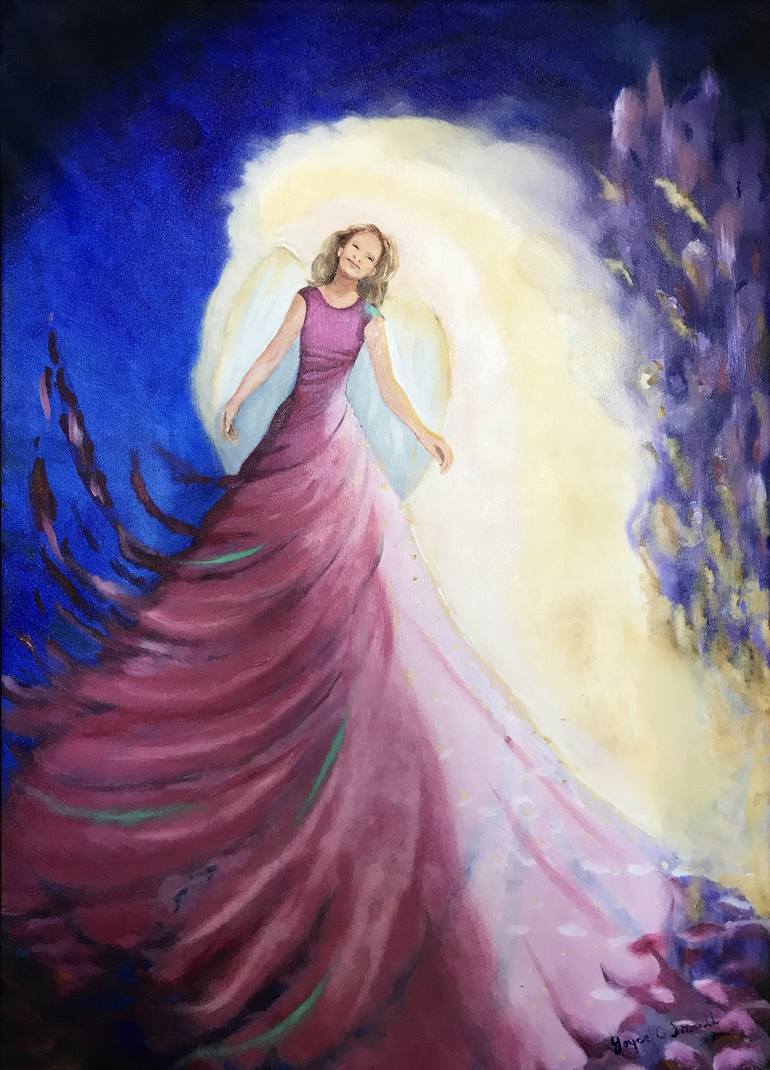 This painting comes with a high quality, narrow gold frame. I love to paint angels because I see them as caring. They are God's "gift", guiding us and giving comfort. Lately, I have begun to paint abstractions as metaphors, and as an expression of feelings. I often use the universal theme of "T...