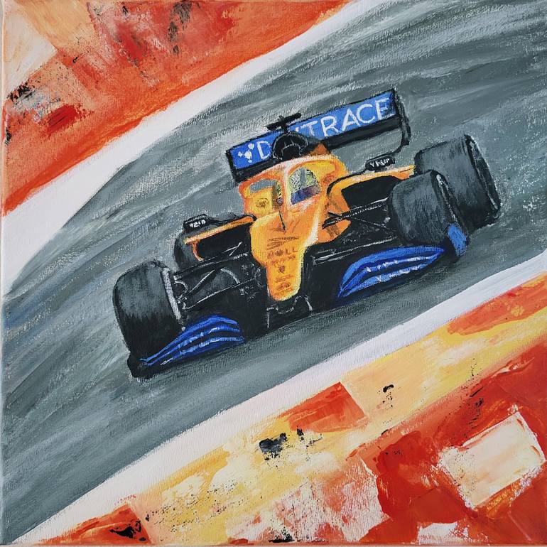A flash of papaya orange streaks across the track—a machine built for glory, a driver chasing the limits. The roar of the McLaren echoes through the circuit as Lando Norris pushes forward, the thrill of competition burning in his veins. The trackside markings, captured in bold, expressive strokes, b...