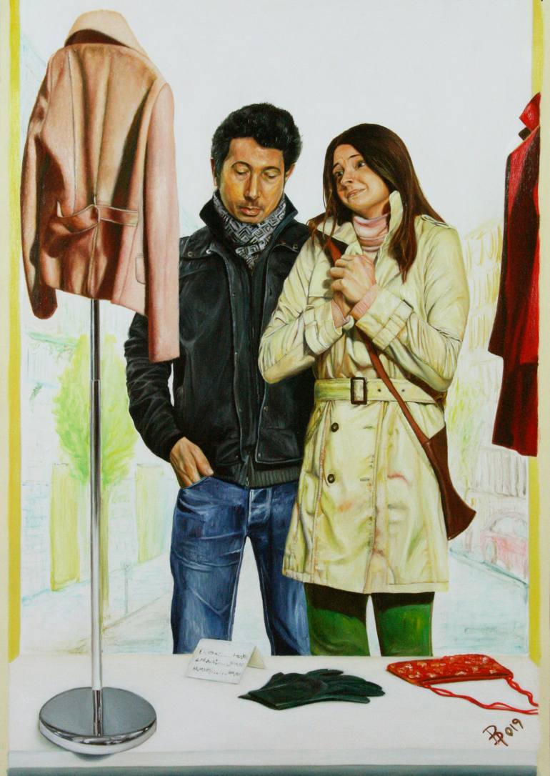 Oil on paper 50x70cm (19.7x27.6in) 2019 framed (framed dimensions 53x73x2cm/21x28.7x0.8in). This painting is the snap-shot of a situation that occurred to me and my girlfriend: we were walking along a street in the city centre while she stopped, amazed by a dress she saw in a shop. Me, I was more i...
