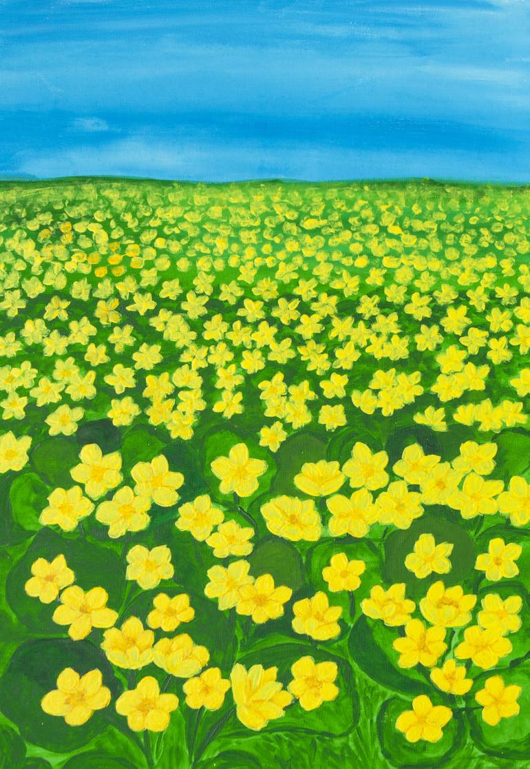 Painting: Acrylic on Canvas panel, vertical: Green meadow with many yellow spring flowers buttercups.