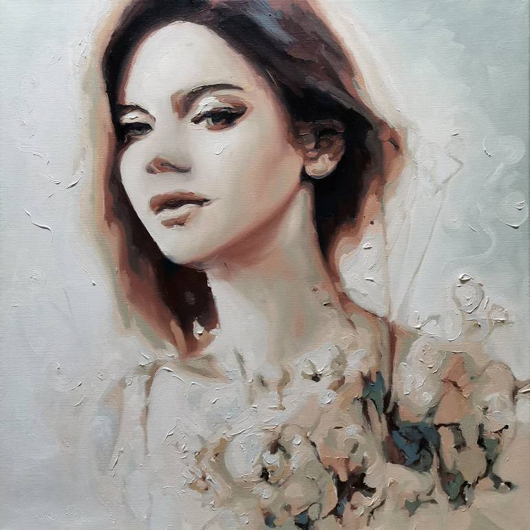"Capturing the essence of timeless beauty, this exquisite square portrait unveils a brunette woman holding a lush bunch of flowers with a grace that resonates with elegance. The artist skillfully employs a light and neutral color palette, creating a serene atmosphere that invites viewers to delve in...