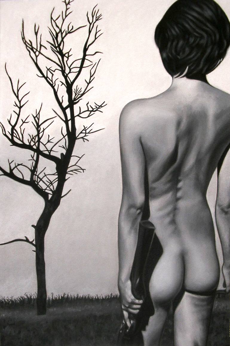 Óleo sobre tablex. Está pintado en blanco y negro.