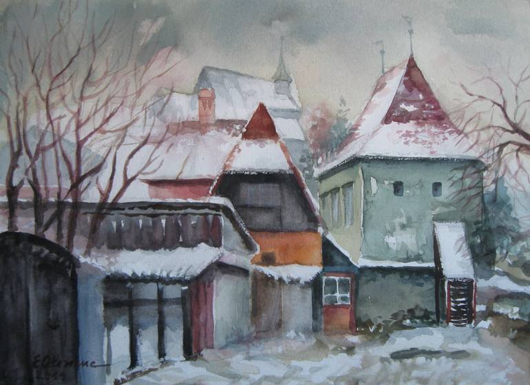 Watercolour painting of Sighisoara, medieval city from Transylvania.