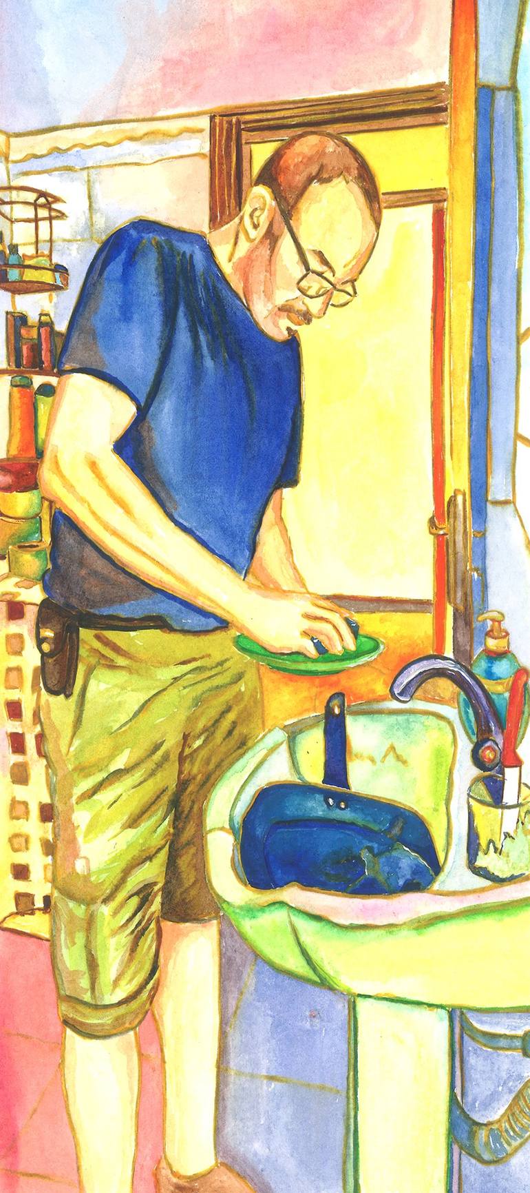 This artwork represents a man doing the dishes in the bathroom using using soft and smooth watercolor technic on canson paper.