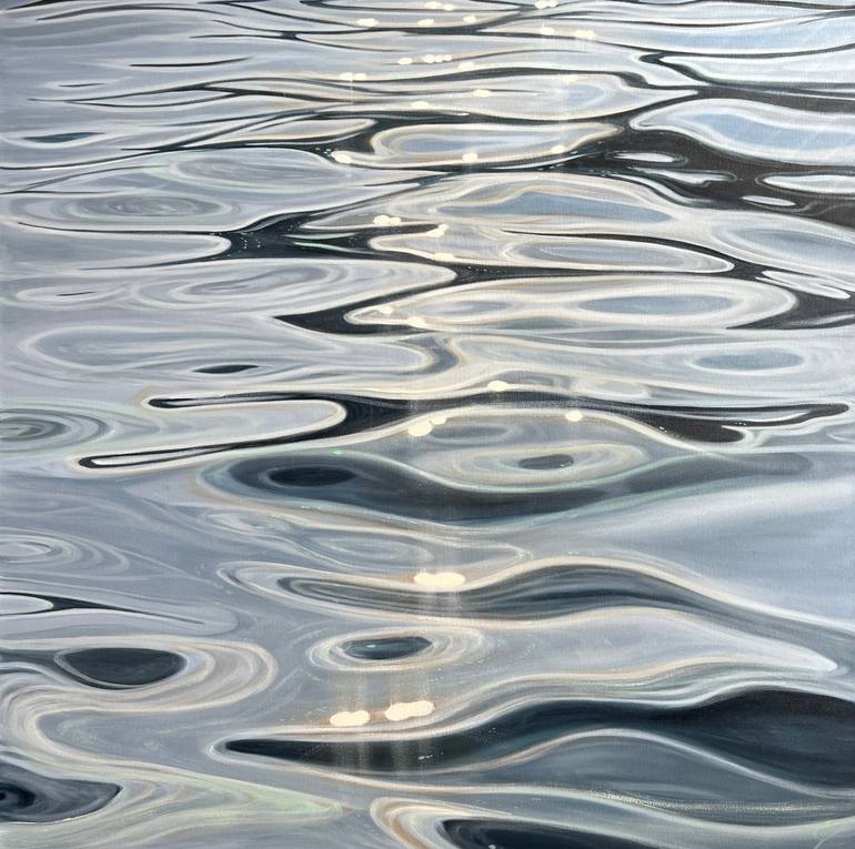 Capturing the essence of water in intricate detail, this original oil painting is a close-up portrayal of light dancing on its surface. This piece captures a sense of depth and movement, evoking a tranquil yet dynamic atmosphere. Oil on deep gallery wrapped canvas 48x48 inches.