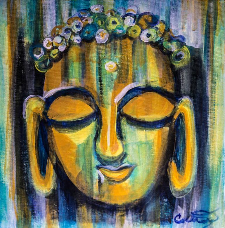 Acrylic on canvas. A peaceful Buddha face. Soothing but vibrant colors. Inspired by meditation and serenity.