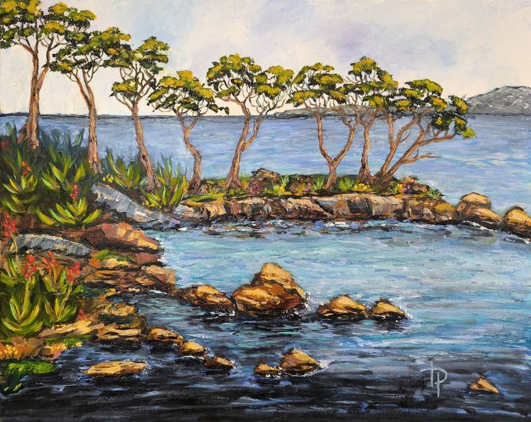 Artist's notes. I love the cliffs of the Mediterranean and wanted to capture this natural wonder on canvas, a place where land and sea embrace in a symphony of color and texture. I was inspired by the contrast between the rugged coastline and the delicate, windswept trees that stretched toward the s...
