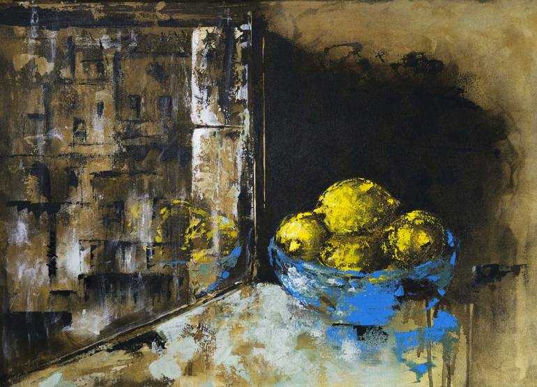 Once I saw lemons in darkness with yellow bodies smooth color. was very much inspired by their calmness and peaceful existance. tried to figure out feelings by painting them indoors, with own eflections and mediterranean street view from the window. a little bit moody but cosy colors.