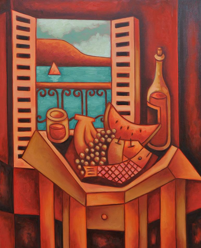 An idyllic Mediterranean still life that may remind you of moments spent with your partner by the sea on vacation, a romantic breakfast or dinner together.