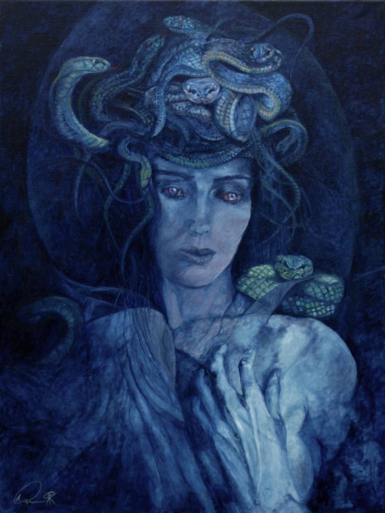 This painting shows the moment Medusa was being turned into her most commonly recognized form. Before that she was a very beautiful woman who was in the Temple of Athena and was raped by Posiedon. Athena being angered chose to change here into the Medusa we all know. I find it terrible that Medusa w...