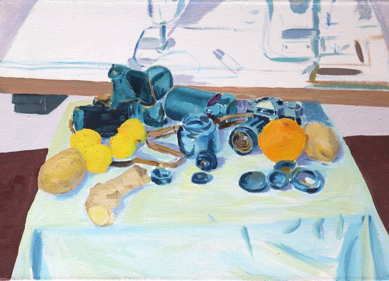 It was made as a study of the different shades of black, surface finishes and such. There are symbols of life (fruits), memory (camera and lenses) and suppressed feelings (leather and plastic cases).