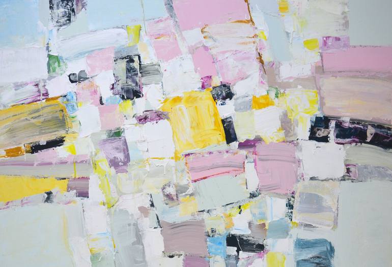 Meeting. Abstract painting in Art Nouveau style, painted with acrylic paints. It is made in a light palette: gray, pink, yellow. The product has a modern aesthetic design. A delicate balance between an ordered geometric structure and a free, spontaneous overlay of shapes, lines, colors. Used high qu...
