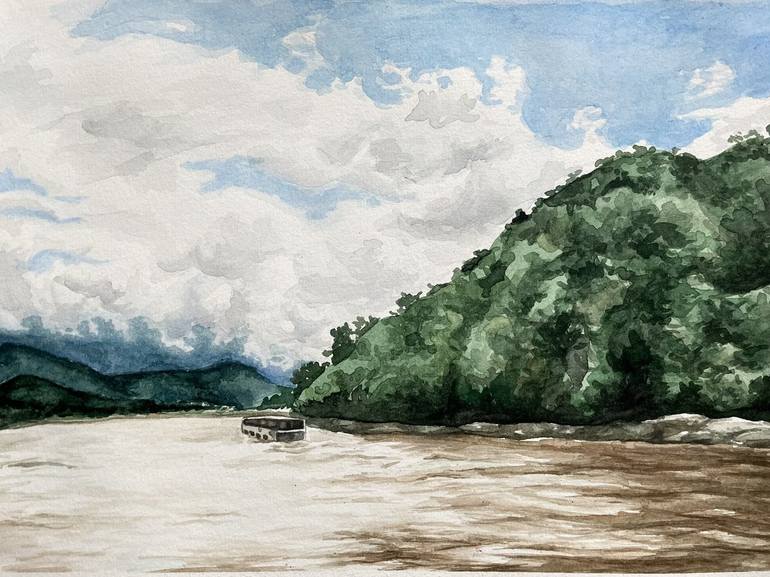 This unframed original watercolour painting depicts a calming landscape. A view of the Mekong river, lying on the border with Thailand and Laos. Its moving waters and fluffy clouds give a sense of serenity. A perfect ornament for a living space. The Mekong river and its surroundings is home to many ...