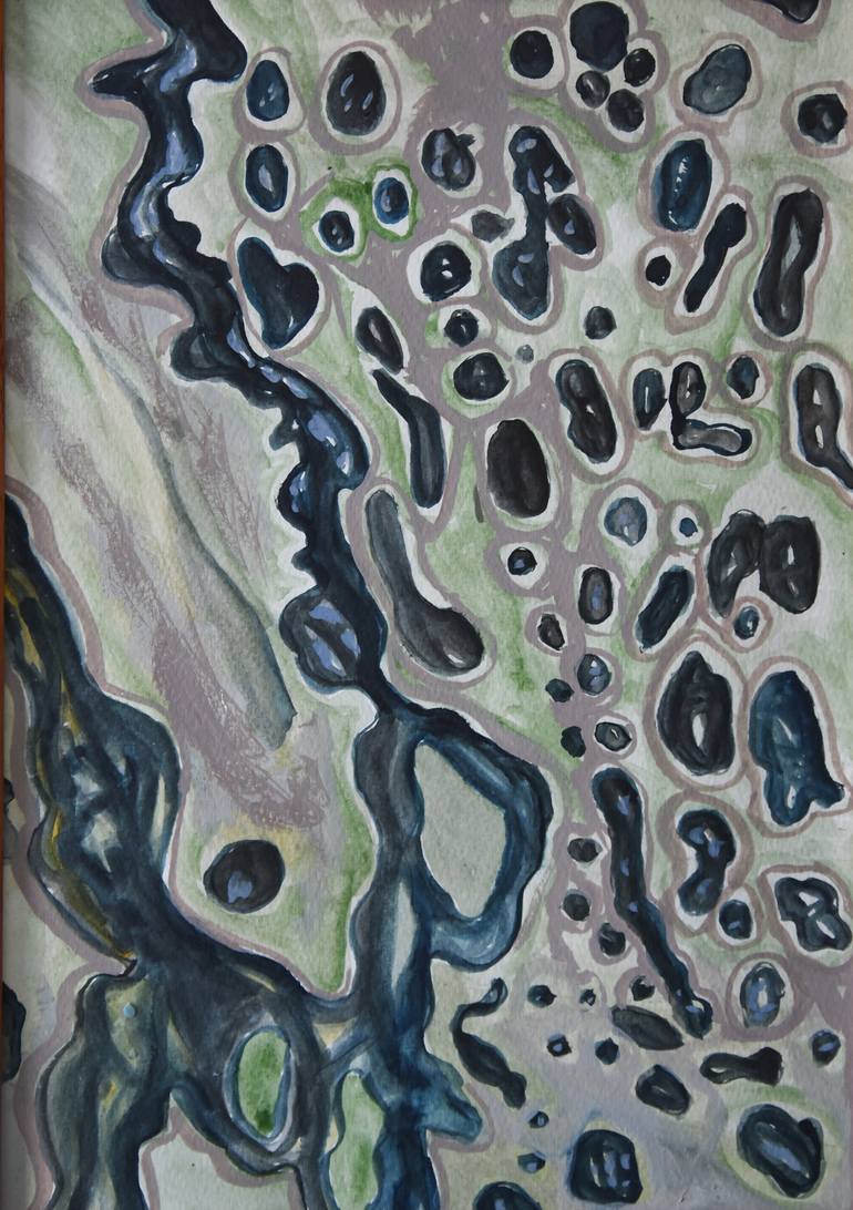 This painting was created using satillite imagery of the Mekong River Wetlands in Laos. It is the watercolor study for the full size encuastic painting in the same collection.
