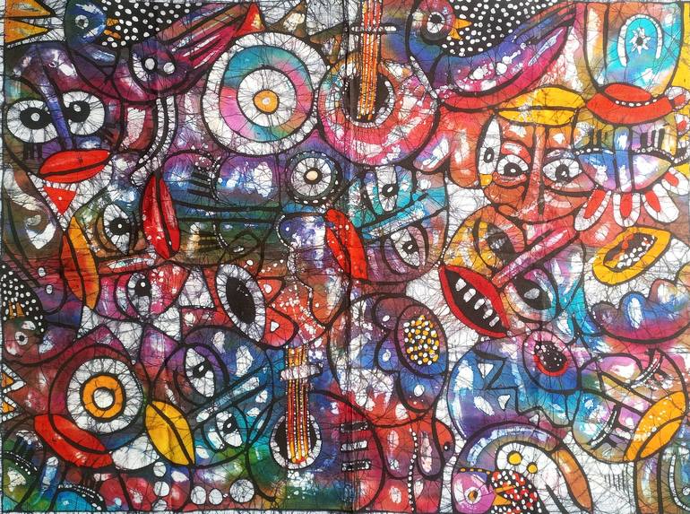 Melodies of the Surreal is a vibrant batik masterpiece that fuses abstract art with the power of music. Colorful shapes, surreal faces, and guitars with dynamic, flowing forms fill the chaotic composition, symbolizing the unrestrained energy of music. The bright red, blue, yellow, and purple hues ...