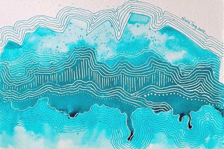 A beautiful development from Metamorphosis I. A collection that redefined the artist's style. This painting is part of Metamorphosis II collection and was created in teal ink, a very symbolic color in representing the colors of the ocean and the lush mountains. Repetitive line patterns emphasize m...