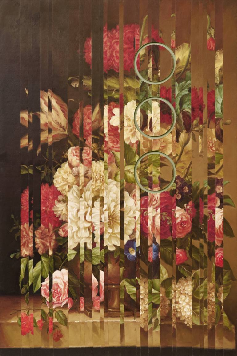 The canvas is mounted on a carved out board. This both adds a three dimensional plane to the artwork and also serves as "counterpoint" of sorts in this rhythmic construction. I like to bring together the warm, innocent and nostalgic feel of these "thrift store" painting against the calculated modern...